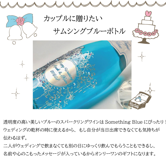 透明度の高い美しいブルーのスパークリングワインはSomething Blueにぴったりです。 ウェディングの乾杯の時に使えるから、もし自分が当日出席できなくても気持ちが伝わるはずです。 二人がウェディングで飲まなくても別の日にゆっくり飲んでもらうこともできますし、 名前や心のこもったメッセージが入っているからオンリーワンのギフトになります。
