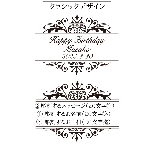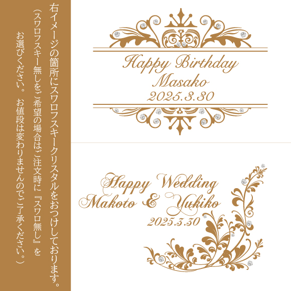 ゴールドでお名前やメッセージを彫刻した豪華なボトルは特別な日により一層輝く思い出となるでしょう。